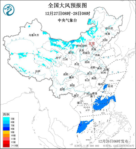 预计,12月26日08时至27日08时,新疆北部、内蒙古西部、西藏北部、青海南部等地有5~6级风,阵风7级;黄海中东部和东南部海域、东海东北部和南部海域、台湾海峡、巴士海峡、台湾以东洋面,南海东北部和中部海域、南海西南部海域将有7~8级、阵风9级的大风,其中台湾海峡部分海域风力可达9级、阵风10级。