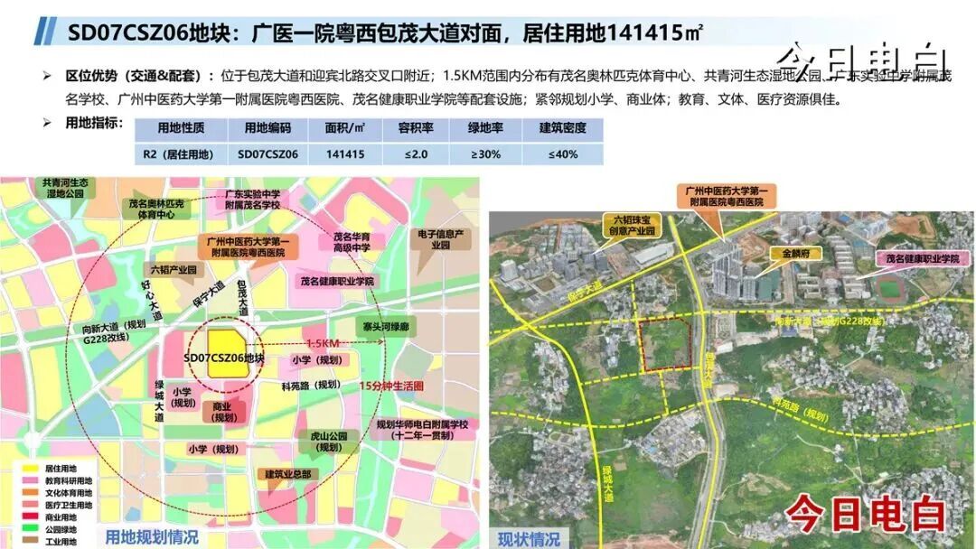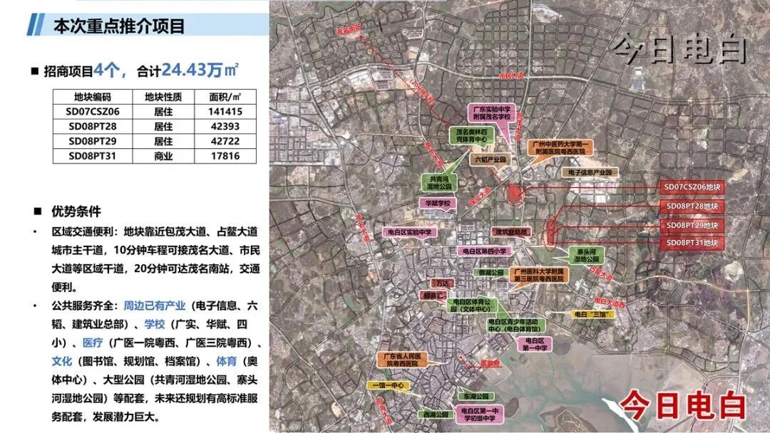 2026年,电白区将陆续推出多块优质地块,其中虎山社区三块地块(SD08PT28、SD08PT29、SD08PT31),居住用地和商业用地共157亩,位于包茂大道与占鳌大道交叉口附近,是最具投资价值的核心地块;电白中医院对面SD07CSZ06居住地块,面积约212亩,位于包茂大道和迎宾北路交叉口附近,1.5公里范围内分布有茂名奥林匹克体育中心、共青河生态湿地公园、广东实验中学附属茂名学校、广州中医药大学第一附属医院粤西医院、茂名健康职业学院等配套设施;